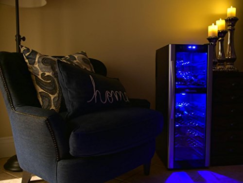 Avalon Bay AB-WINE27DS Dual Zone Wine Cooler The Avalon Bay AB-WINE27DS Dual Zone Wine Cooler keeps your wine safe. Its state-of-the-art thermoelectric cooling system chills your wine perfectly and has two cooling zones that enable you to store red and white wine together in the same unit. The AB-WINE27DS holds up to 27 wine bottles and features an eye-catching, blue LED light, which illuminates and showcases your wine. The temperatures in each zone are fully adjustable, and can be raised or lowered with the push of a button. Special Features Stores 27 Standard Size Wine Bottles Dual Cooling Zones Silent Thermoelectric Cooling System 9 Removable Chrome Shelves Blue LED Light Compact, Freestanding Design Striking & Compact Design The Avalon Bay AB-WINE27DS is a sophisticated cooler with a back cabinet and steel trimmed door that blends seamlessly into any room. It comes fully equipped with nine chrome plated wine racks that slide out to give you full access to your wine. The racks can store up to 27 standard size bottles of wine and each rack can be completely removed in order to make room for larger bottles. The cooler is 19.75 inches long, 13.63 inches wide, and 39 inches high, which makes it easy to store anywhere in your home: kitchen, den, dining room, living room, or home bar. Dual Zone Cooling The AB-WINE27DS comes with two cooling zones for red and white wine. The upper zone can be set for 44°-64°F and the lower zone can be set for 51-64°F, the perfect ranges for either reds or whites. The temperatures are controlled with two sets of push button controls at the top of the unit. The controls also track and display the temperature in each zone using dual LED displays. Each display is connected to a separate zone, which uses an independent thermostat to pipe in cold air as needed to preserve the flavor, aroma, and structure of your wine. Thermoelectric Cooling System The AB-WINE27DS is powered by a thermoelectric cooling system. It is not only powerful, but silent and vibration free. With strong insulation and a double pane glass door, it guarantees nothing will disturb your wine while it's being stored.