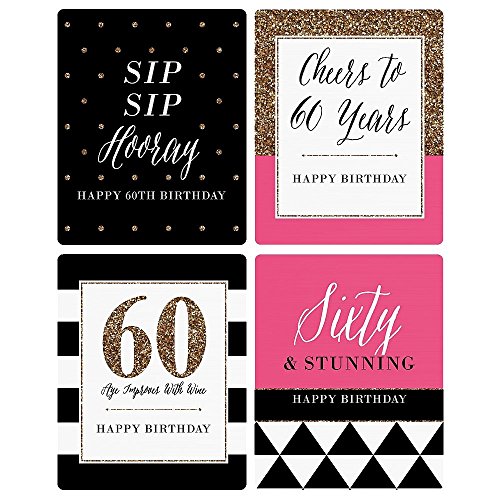 - Chic 60th Birthday - Pink, Black and Gold - Wine Bottle Labels Birthday Gift - Sold in a Set of 4 - Each label has an unique look.