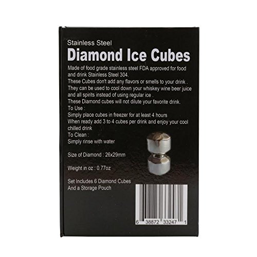 Introduction Stainless Steel Diamond Cubes are the perfect alternative to ice cubes for chilling the drinks. Their ability to chill drinks without diluting them or spoiling their flavor, makes them collectible items for a discerning drinker. The cubes are suitable for chilling all kinds of alcohols like whiskey, wine, vodka and other spirits. These chillers provide a quick chill to drinks, sparing the need to wait for the refrigerator to cool them. Description The cubes are 26x29 mm in size and weigh about 0.77 ounces each. The set includes 6 diamond shaped (dodecahedron) stainless steel cubes and a velvet pouch to hold them together. The diamond cubes have a liquid interior which makes them light enough to not damage the glass and heavy enough to sink to the bottom. The attractive velvet magnetic pouch renders the entire package beautiful, makes it easy to carry around and turns it into a perfect gift item Instructions Freeze the cubes for at least 2 hours before using them for drinks. After placing them in drinks, wait for a few minutes to let the cubes chill the drink. The cubes are quite small and 3 to 4 of them should do the job for most people. It is recommended to wash the steel cubes before first use and also after every use. A quick rinse will turn the cubes as good as new. Parents are advised to keep them out of reach of their children at all times because of their easily swallowing size. To prevent the cubes from hitting the teeth or even accidentally swallowing them during the last swigs, it is strictly advised to remove the cubes before consuming the alcohol.