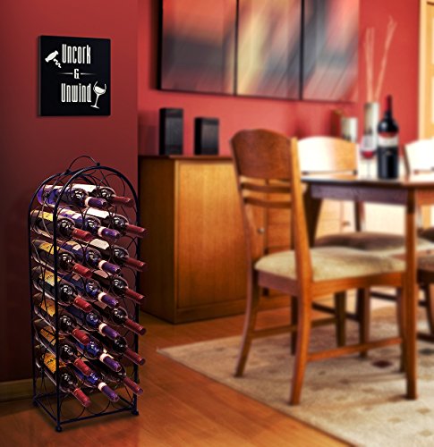 Conveniently and elegantly store your favorite bottles of wine with Sorbus® Bordeaux Chateau Wine Rack! This creatively designed wine rack conveniently holds up to 23 bottles of your favorite wine. Each wine bottle is stored horizontally ensuring both the wine and the air bubbles are in contact with the cork. Keeping corks moist enables wine to stay fresh longer until you're ready to enjoy. It is made of durable construction and strong castings for long-lasting use. The entire wine rack is purposely designed with a sleek and chic look to accent any home, kitchen, dining room, or wine cellar. The black coat finish gives a touch of refined elegance from the old French Quarter. Adorn your most prized bottles of wine while creating the most useful and convenient storage! This arched, free-standing wine rack also makes a great gift for that wine aficionado in your life or for any special occasion. This wine rack can be easily cleaned with a dry cloth for lasting quality years of use. No assembly is required. It measures approximately 7"x13"x34" and holds most standard wine bottles wine bottles.