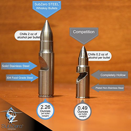 - ✓ Highest quality stainless steel bullet shaped whiskey stones on the market. Made out of food grade 304 solid stainless steel, these bullets chill your drink more effectively than standard metal ice cubes and look better than your average sipping stones!