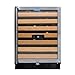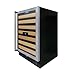 Front exhaust for under counter or free-standing installation. Push button temperature control panel with LED display. Gliding shelves with wood trim. Adjustable legs with black cabinet. Soft?blue interior light. Thermal paned glass door. Temperature range: 45-65F. Approx. bottle count: 50. Made from metal. Silver finish. Assembly required. Depth with handle: 26 in.. Overall: 25 in. L x 24 in. W x 34.5 in. H (154 lbs.). Create the ideal environment?for your collection with wine cooler with interior display.