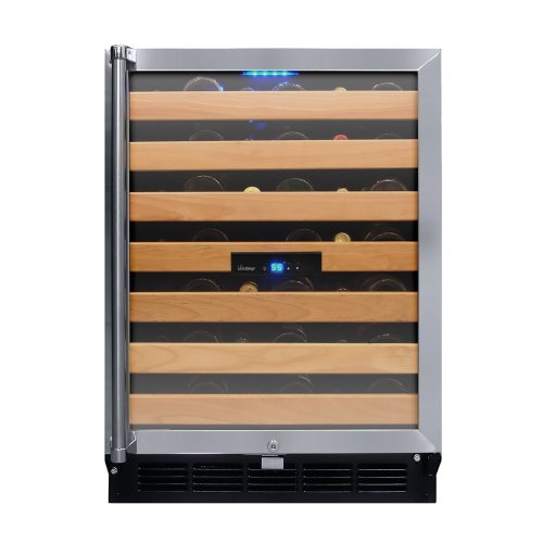 Front exhaust for under counter or free-standing installation. Push button temperature control panel with LED display. Gliding shelves with wood trim. Adjustable legs with black cabinet. Soft?blue interior light. Thermal paned glass door. Temperature range: 45-65F. Approx. bottle count: 50. Made from metal. Silver finish. Assembly required. Depth with handle: 26 in.. Overall: 25 in. L x 24 in. W x 34.5 in. H (154 lbs.). Create the ideal environment?for your collection with wine cooler with interior display.