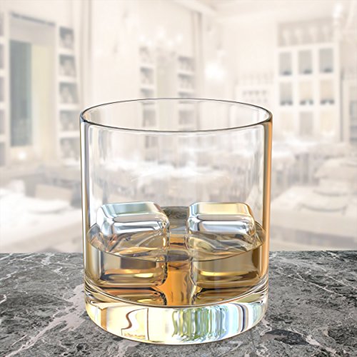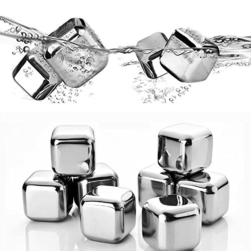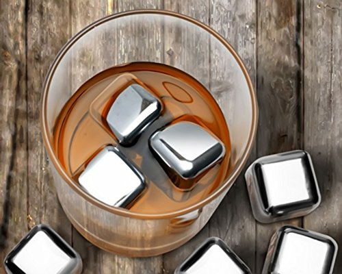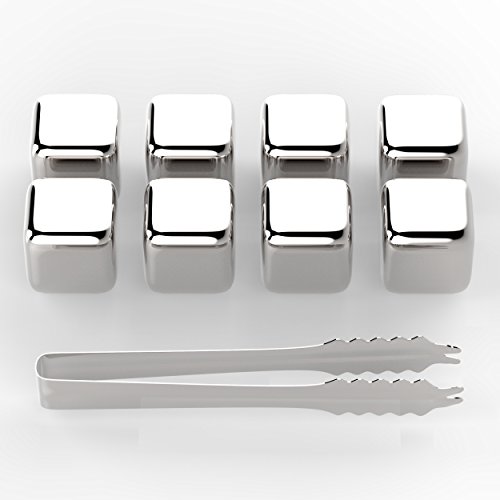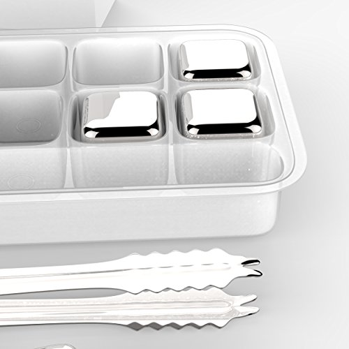 Our Whiskey Stones Set includes 8 stainless steel cubes and tongs. Each cube is made of solid, premium quality stainless steel with food grade chilling gel inside, each cube is 1" x 1" x 1" in size. It will keep your drink chilled and will not dilute your fine spirits. Even better, because stainless steel is non-porous and does not rust, the true flavor of your drinks will not be impacted by odors or corrosion. All you will taste is refreshing, full-bodied flavor of your beverage. Our Whiskey Stones have rounded smooth edges, they will not damage drink ware. They are safe to use and easy to clean. Store them in their convenient, durable BPA-free tray for organization in your freezer. We are including a handy ice tong to add our whiskey stones to your drink with. This deluxe 9 piece bar accessory is an ideal gift for any connoisseur of fine spirits.Enjoy the full refreshing flavor of your favorite beverages