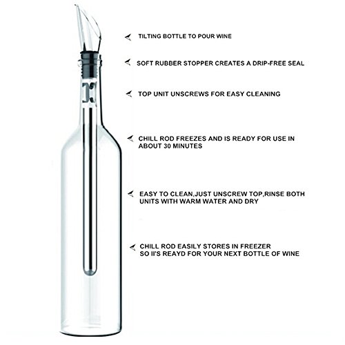 - ★EASY TO USE, STORE AND CLEAN: This 3-in-1 Iceless Wine Chiller is Elegantly Designed, Light Weight and Portable: Chill the stainless steel rod in the freezer for at least 30 minutes and you are ready to enjoy a Perfect Glass of wine. Wash with warm water, dry and re-use. Always be ready for that next bottle of wine! BUY it, NOW, for an Exceptional Experience!