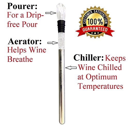 Wine Chiller, Aerator and Pourer: Enjoy a Glass of Perfectly Chilled Wine with the 3 in 1 Stainless Steel Wine Chill Rod. Everest Essentials Iceless Wine Chiller comes in a Wine Accessories Gift Box