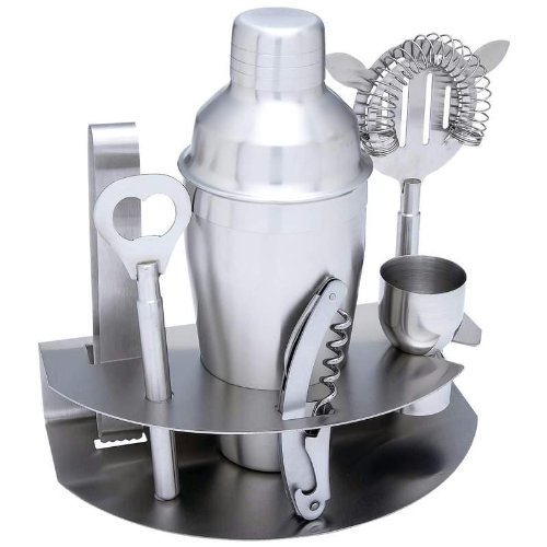 This handsome set is an essential addition to any personal bar. Guests will look on in admiration as you prepare their drinks with expert care. Includes 18.6oz cocktail shaker, strainer, bottle opener, corkscrew, double jigger, ice tongs, and stainless steel rack. Limited lifetime warranty. White box.