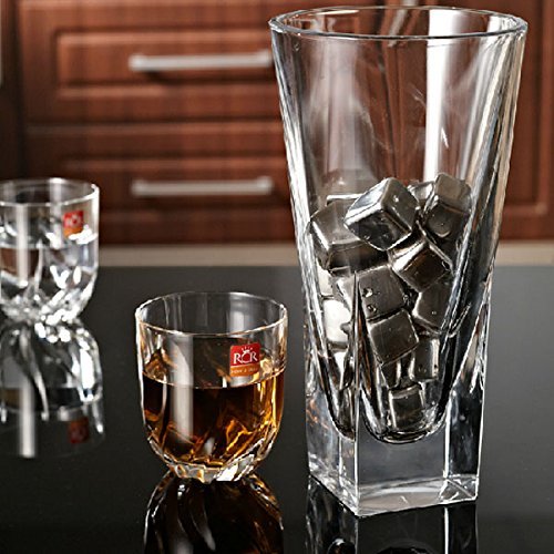 6 Pcs stainless steel whiskey cubes, each stone size: 1*1*1 inch, proved by SGS & PDA Caution: The whiskey cubes only for cooling drinks; Never ever put the cubes into your mouth; Keep out of reach of your children