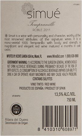 2011 Vicente Gandia Simue Tempranillo Roble, Ribera del Duero, Red Spanish Wine 750ml