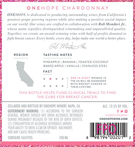 HALF of profits from ONEHOPE California Chardonnay are donated to fight breast cancer by providing clinical trials.