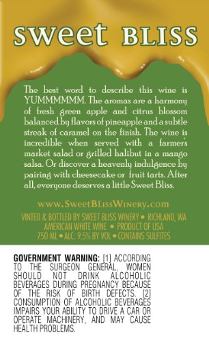 Feeling sassy? Sweet Bliss White is a fun wine with layers of flavors and a streak of bright character. So many sweet white wines are cloying, flabby, perfume-y or just plain boring... Not Sweet Bliss White. The label artwork of Sweet Bliss White depicts the essence and flavors of the wine superbly. A crisp green apple dipped in luscious caramel irresistibly inspires you to delight in this lively and refreshing white wine. The aromas of citrus fruit and honeysuckle leap out of the glass, while flavors of green apple and honey are artfully balanced by vibrant acidity for a bracingly clean finish. Sweet Bliss White is exquisitely versatile. It is outrageous with blackened catfish, spicy chicken wings or Thai cuisine. For the ultimate indulgence, pair Sweet Bliss White with cheesecake, crème brulee and ice cream. We're certain that you'd also delight in Sweet Bliss White on its own as a heavenly aperitif.